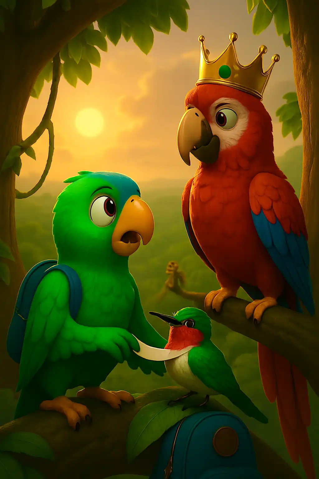 A pak — najednou — ticho. Francesco přistál na poslední větvi. Před ním seděl papoušek. Ale ne ledajaký. Měl peří zlaté jako slunce, oči hluboké jako řeka a na hlavě korunu z pestrobarevných per. Byl klidný, vznešený… a moudrý.